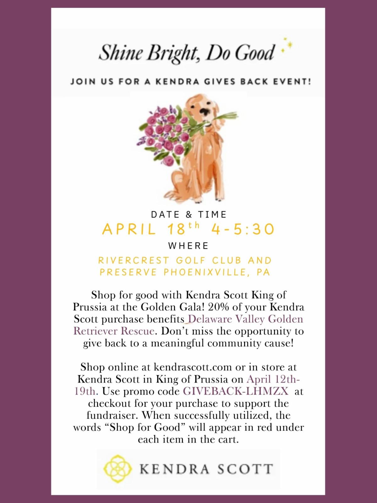 Kendra Scott LLC will have a pop-up event at our Golden Gala, and 20% of your purchase that evening will be donated to DVGRR!