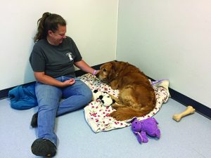 Talk with a voice that is natural – a soft and steady voice while reading and practice intermittently giving the dog eye contact between pages. Shy dogs respond better to soft, happier tones versus loud, deep authoritative tones. If the dog is comfortable being petted, feel free to do so while reading. If the dog enjoys treats, try putting a few in your hand and randomly give the dog a treat during the course of the book. This activity helps with bonding by getting the dog familiar with your voice in a low-pressure situation.