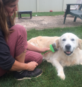 With this activity and all activities suggested, keep your sessions short. For example, pet and brush your dog for about five minutes. Then walk away and give them time out of the “pressure zone.”
