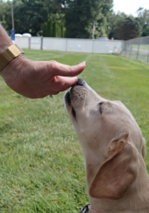 • Wait for your dog to put their nose to your hand looking for the treat. Say, “Yes!” and reward with a treat from your opposite hand (not the hand the dog is touching). Even if they touch your hand by accident, it still counts! At first, if they won’t actually make contact, reward getting close, then slowly work up to closer and closer.