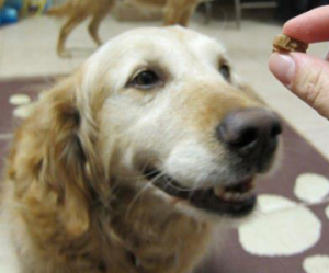 • Put a small treat in between your fingers or rub your hand with a food that smells delicious to your dog.