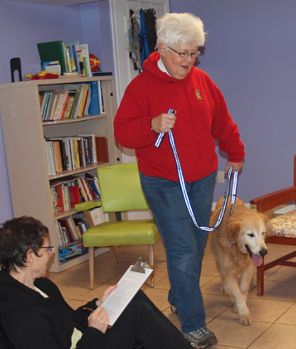 2. Move the chairs slightly closer together. Walk through again and remember to praise and reward. If the dog shows resistance, go back to the ten-foot spacing and stick with that until they get more comfortable.
