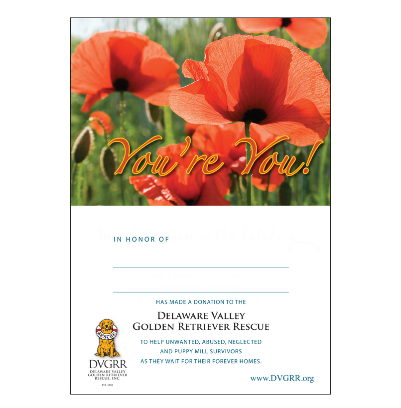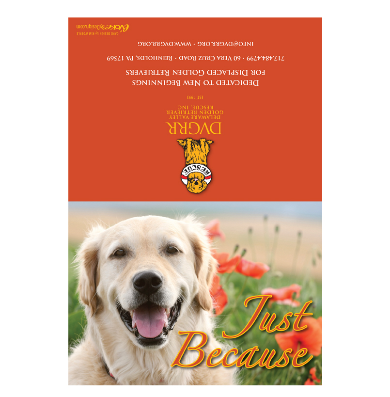 Who wouldn’t love having their day brightened with a big, broad Golden smile? This charming message will delight that special person in your life and becomes even more meaningful when it helps homeless Golden Retrievers. We will send this card on your behalf for a donation of $25.00 or more. We’ll hand write the card and envelope, then drop in the mail for quick delivery to the recipient of your caring wishes.