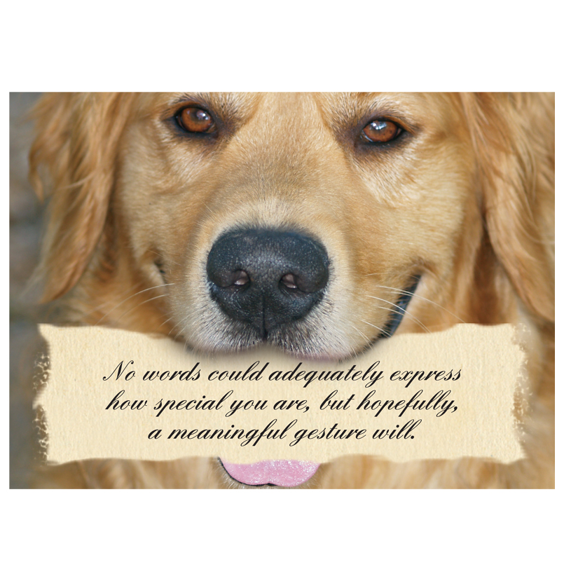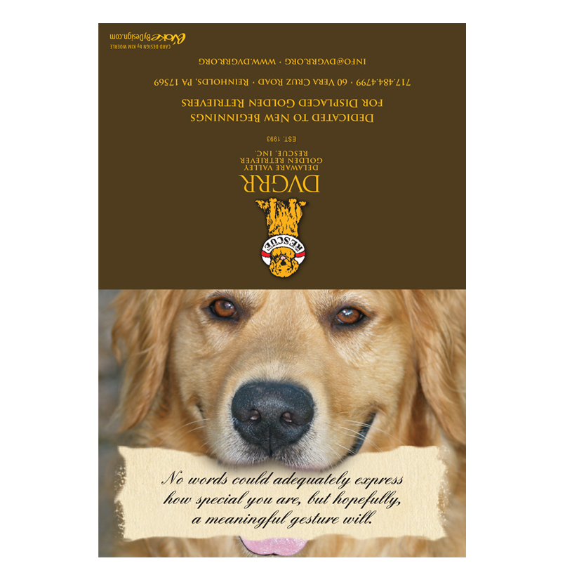 A Thank You note becomes especially meaningful when it helps homeless Golden Retrievers. We have designed this lovely card that we will send on your behalf for a donation of $25.00 or more. We will hand write the card and envelope, then drop in the mail for a quick delivery to the recipient of your thoughtful wishes.
