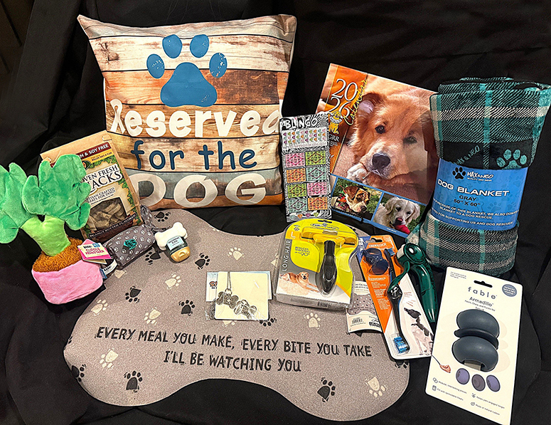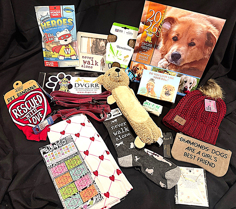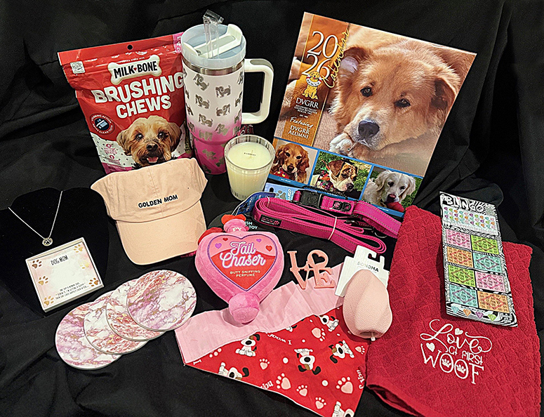 Valentine’s Day is around the corner, so it’s time for a reminder that “Dogs Are a Girl’s Best Friend, NOT Diamonds!” You can add a little red to your wardrobe with the Puppie Love hat, and your pup will love a new RED collar and leash with a “Rescued with Love” bandana. A pretty paw print bar necklace reminding you that your pup is a true faithful companion. We included socks and a photo frame with the reminder that “You Never Walk Alone” when your pup is by your side. Dog treats and toys, a heart-theme dish towel, and a DVGRR car magnet are just for fun along with a “Do You Look Like Your Dog” memory game.